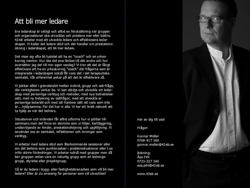 Bra ledarskap är viktigt och alltid en förutsättning när grupper och organisationer ska utvecklas och prestera mer eller bättre. 42AB arbetar med att utveckla ledare och effektivisera ledarskapet. Vi kallar det ledare stöd och det handlar om prestationsökning i ledarskapet, att bli mer ledare.